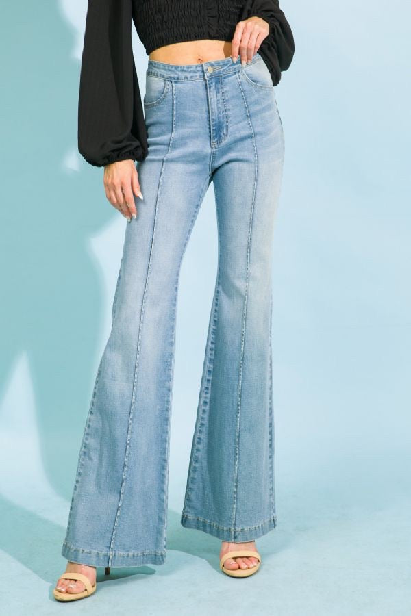 Make a statement with these Indigo Trousers! Show off those long legs in this light wash denim, with its front center seam and pocket detailing. Perfect for adding a quirky touch to any outfit. The 34" inseam offers the ultimate chic look!